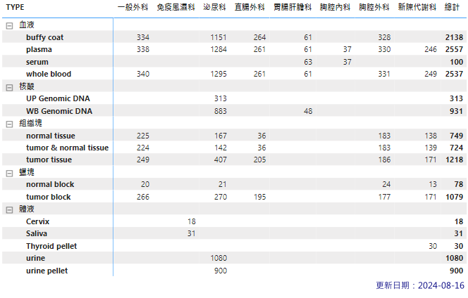 關於我們 │ 倫理委員會 │ 入庫/出庫 │ 申請表單 │ 檢體庫存│ 資料資訊運用計畫 │ 相關法令與規定 │ 相關網站