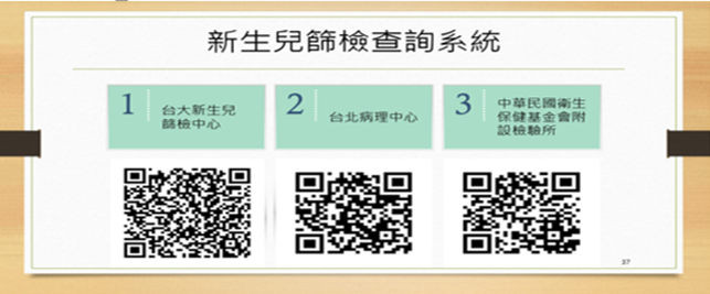 - 以上新生兒篩檢疾病相關資訊可掃下列各新生兒篩檢中心Q-R CODE,查詢相關資訊。