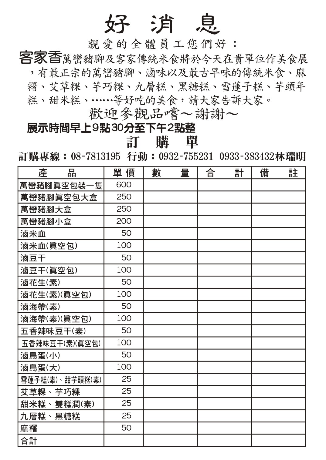 更多商品內容及聯絡電話,如【附件】歡迎來電預訂新版萬巒豬腳訂購單.