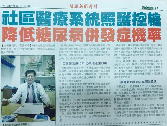 黃彬分享,一位患者陳先生,在民國103年底,HbA1C曾高達10.6%,餐後血糖更高至440 (mg/dl),口服藥效果不佳, 後來接受建議改以胰島素NOVOMIX,早、晚餐前各一針治療,且加上社區醫療系統的照護,不但HbA1C已降至6.6%,身體狀況也大幅提升。