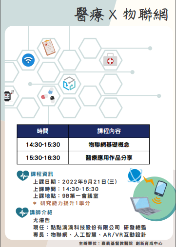 第一小時,可以學習到物聯網基礎概念、簡介 ; 第二小時,講師將帶來物聯網開發工具以及於醫療應用之實作案例。
