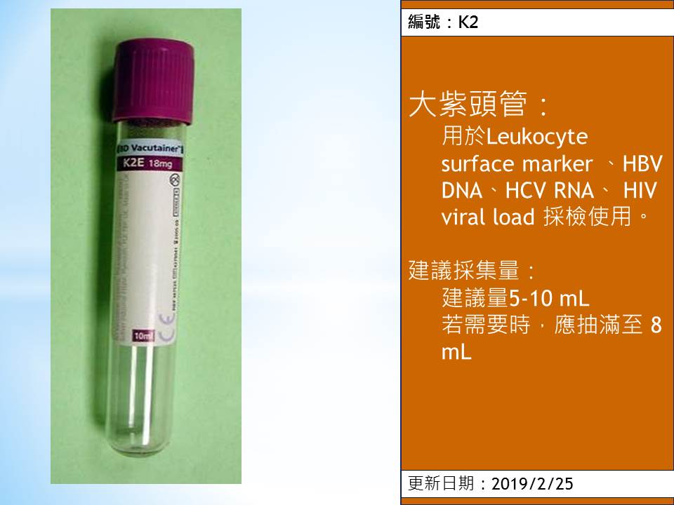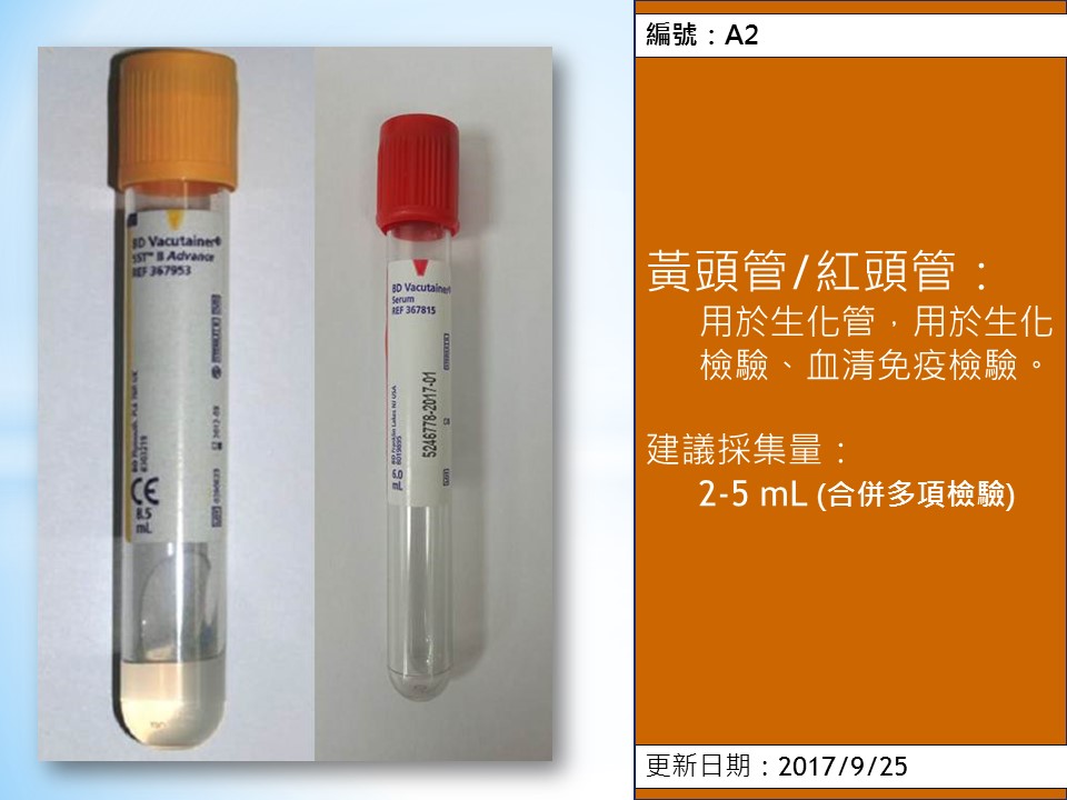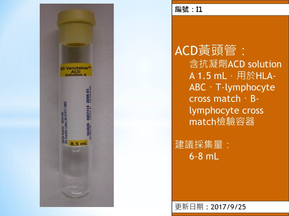 含抗凝劑ACD solution A 1.5 mL,用於HLA-ABC、T-lymphocyte cross match、B-lymphocyte cross match檢驗容器備註: |