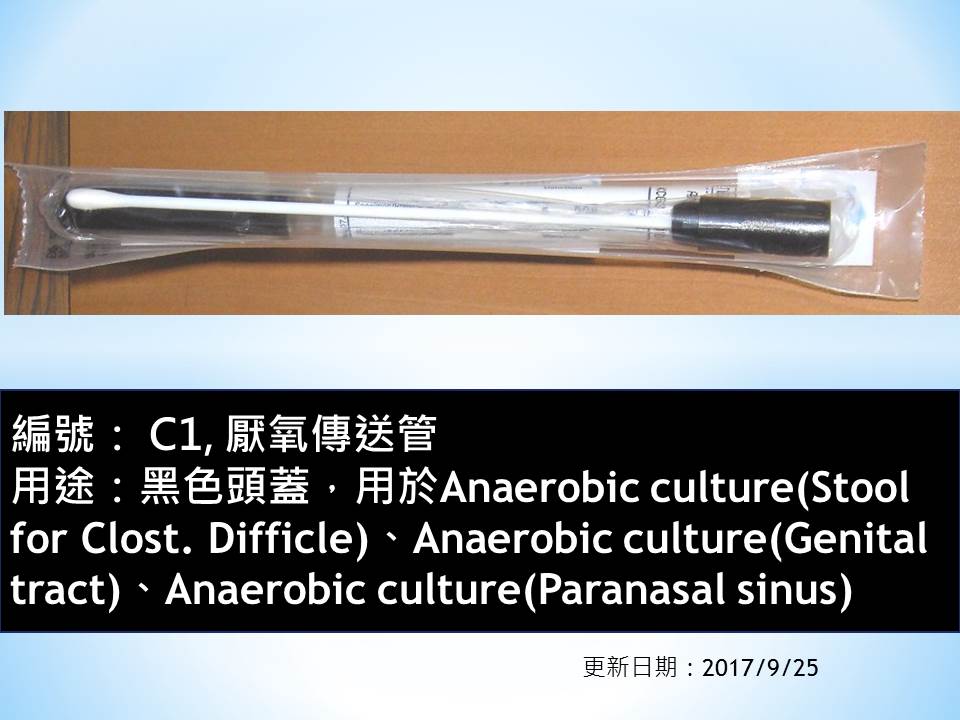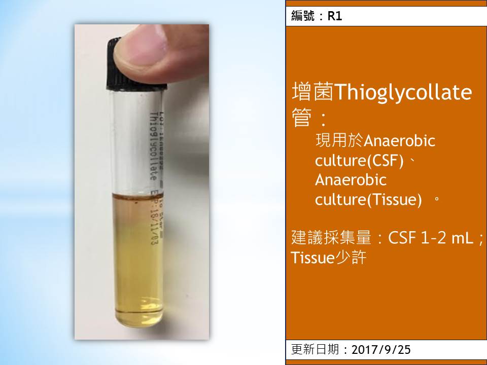 現用於Anaerobic culture(CSF)、Anaerobic culture(Tissue) 。備註:建議採集量:CSF 1-2 mL;Tissue少許 |