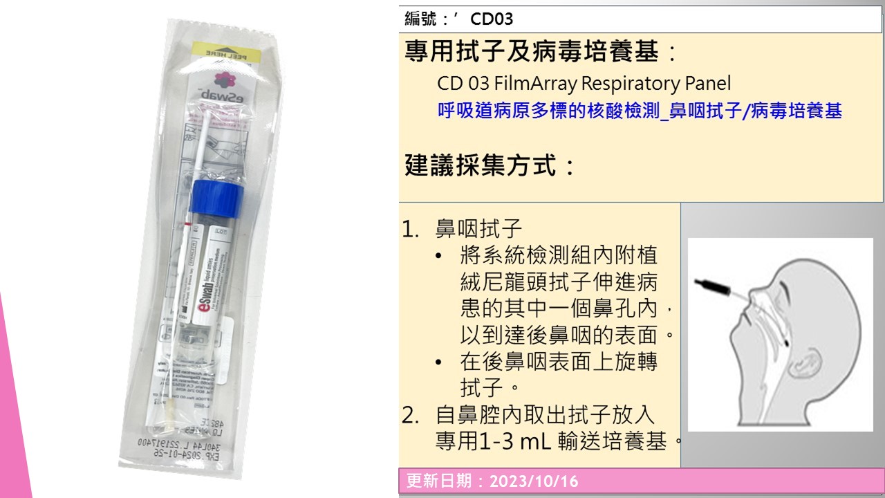 專用管,請至微生物室拿Swab及病毒傳送培養基。採檢鼻咽拭子檢體,放入輸送培養基,立即送檢。備註: |