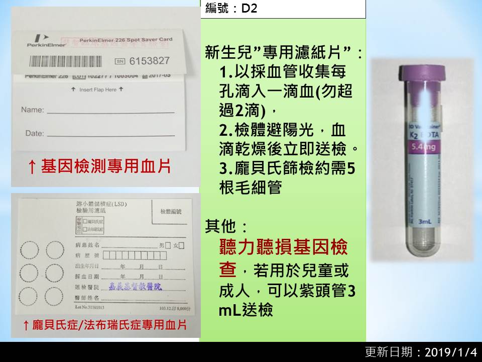 可用於新生兒呼吸中止基因檢測*、新生兒呼吸中止基因檢測、新生兒聽損基因檢測*之檢體收集。可用於Pompe Disease、 Fabry Disease之檢體收集。備註:用法:1.以採血管收集每孔滴入一滴血(勿超過2滴),2.檢體避陽光,血滴乾燥後立即送檢。 |