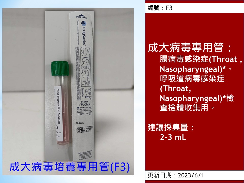 限使用Virus culture*檢查檢體收集。備註:2-3 mL,檢體採集後請以冰浴方式立即運送,檢體若無法立即運送可存放在2-8℃冰箱最多48小時。 |