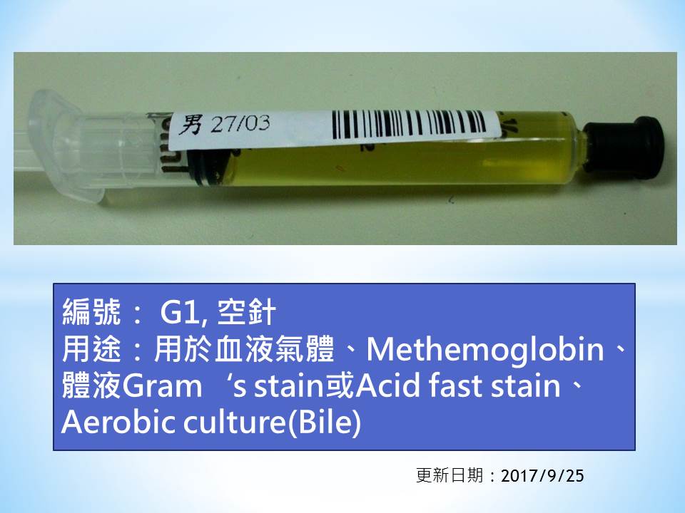 用於血液氣體、Methemoglobin、體液Gram‘s stain或Acid fast stain、Aerobic culture(Bile)備註: |