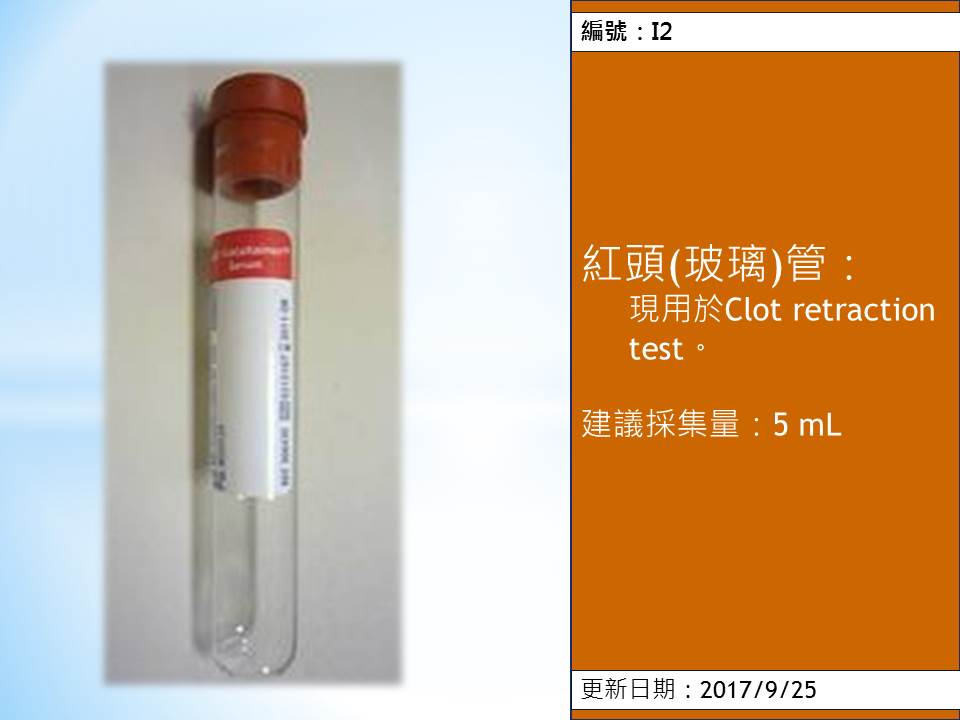 現用於Clot retraction test。備註:建議採集量:5 mL |
