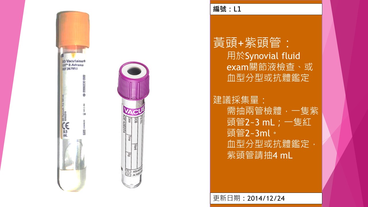 用於Ascites/ Peritoneal、Pleural/Peric. Fluid analysis常規檢查。備註:需抽兩管檢體,一隻紫頭管2-3 mL,一隻紅頭管2~3ml。 |
