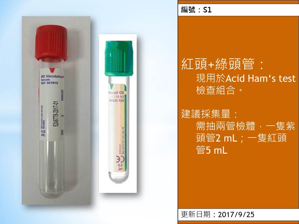 現用於Acid Ham‘s test檢查組合。備註:建議採集量:需抽兩管檢體,一隻紫頭管2 mL;一隻紅頭管5 mL |