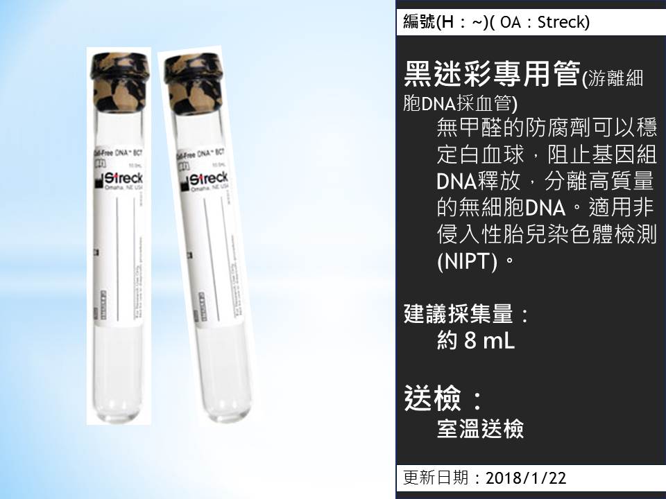 無甲醛的防腐劑可以穩定白血球,阻止基因組DNA釋放,分離高質量的無細胞DNA。適用非侵入性胎兒染色體檢測 (NIPT)。備註: 室溫送檢 |