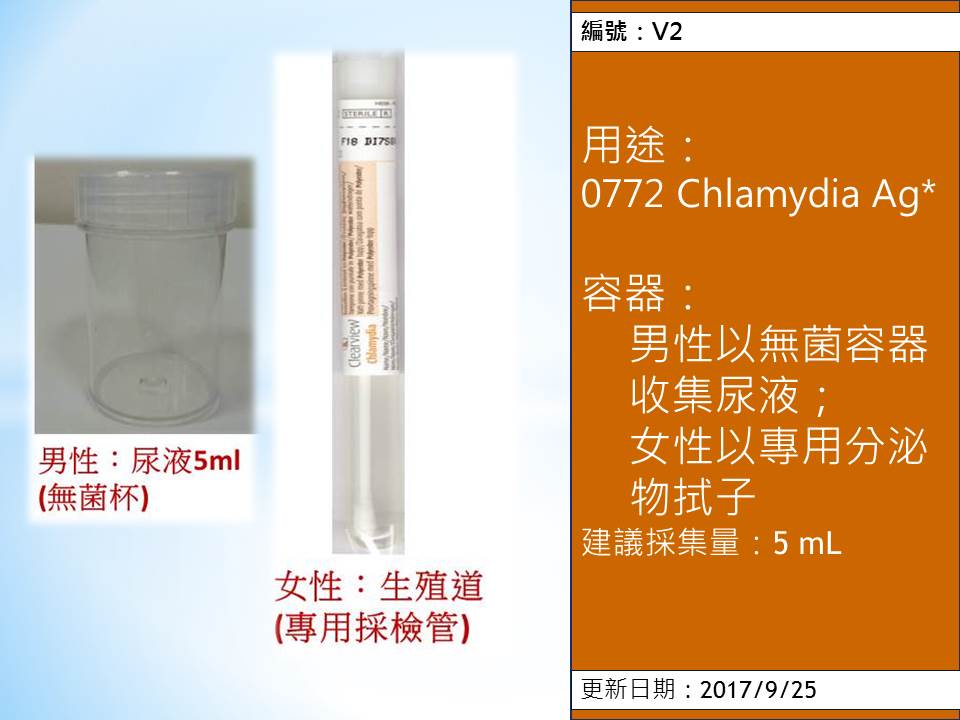 0772 Chlamydia Ag*男性以無菌容器收集尿液;女性以專用分泌物拭子 |