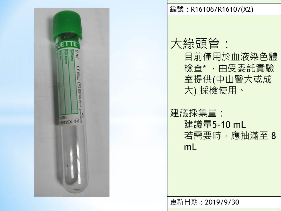 目前僅用於血液染色體檢查* ,由受委託實驗室提供(中山醫大或成大)採檢使用。備註:建議採集量:抽滿,約 8 mL |