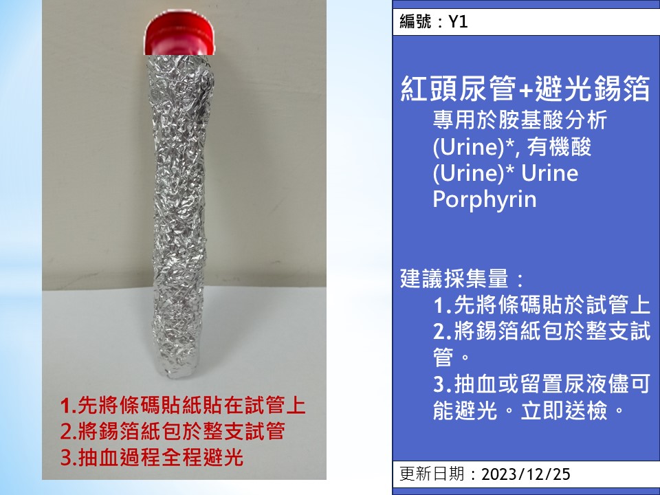 專用於胺基酸分析(Urine)*, 有機酸(Urine)* Urine Porphyrin備註:建議採集量: 1.先將條碼貼於試管上。2.將錫箔紙包於整支試管。3.抽血或留置尿液儘可能避光。立即送檢。 |