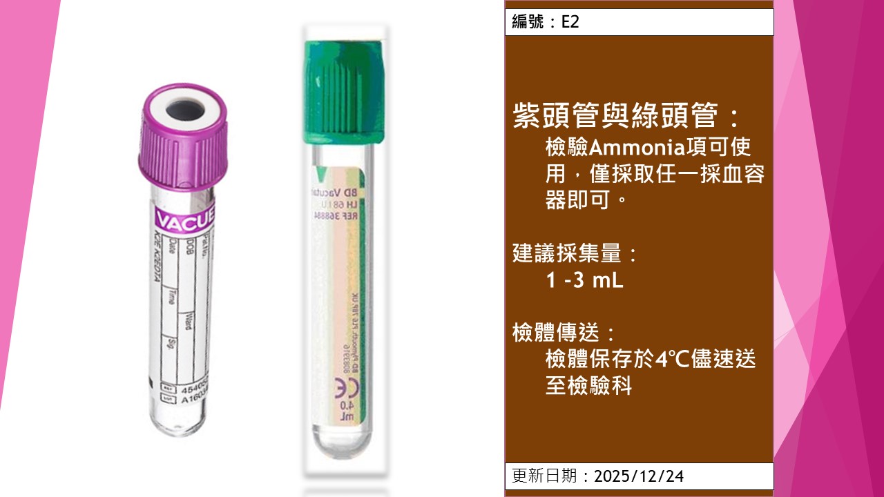 採集注意 | 1.遵照一般檢體採集/送檢原則。2.檢體容器也可使用綠頭管(Li heparin、Na heparin)。 | ||