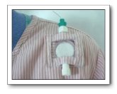 創新作法:「硬脊膜外注射」普遍使用在自然生產的產前無痛分娩及剖腹生產的麻醉與術後止痛。當產婦回到產後病房時,護理人員會協助將產婦導管遠端給藥處,以透氣紙膠黏貼在哺乳衣上來固定導管,但產婦更換衣服時,須將黏於衣服上的透氣膠布撕開後再重覆黏貼,或是活動時會不慎磨擦到透氣膠布,使透氣紙膠黏性不佳,而需時常更換;紙膠黏貼處也常有翹起情形,顯得極不美觀,並造成產婦擔心導管滑脫,進而影響產婦哺餵母乳的姿勢與意願。 |