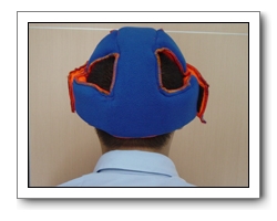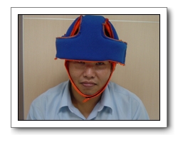以維護病人安全為出發點,採泡棉和宣紙製成“無敵風火帽”。 |
