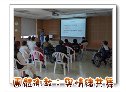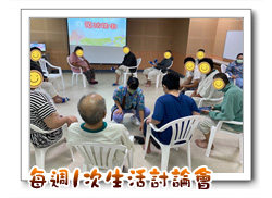 安排住院病人參加病房的常規活動(如:生活討論會、團體活動等)、手工藝活動、節慶活動,讓病人能表達住院期間的感受或建議,並不與社會脫節。 |