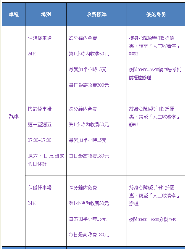 停車第1小時內收費30元 (若未滿20分鐘則優免),停車超過1小時以後,每半小時15元計費(含未滿半小時),每日最高收費300元。