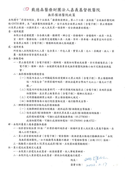 本院無菸檳酒醫院政策,敬請員工與民眾一同支持無菸檳酒環境