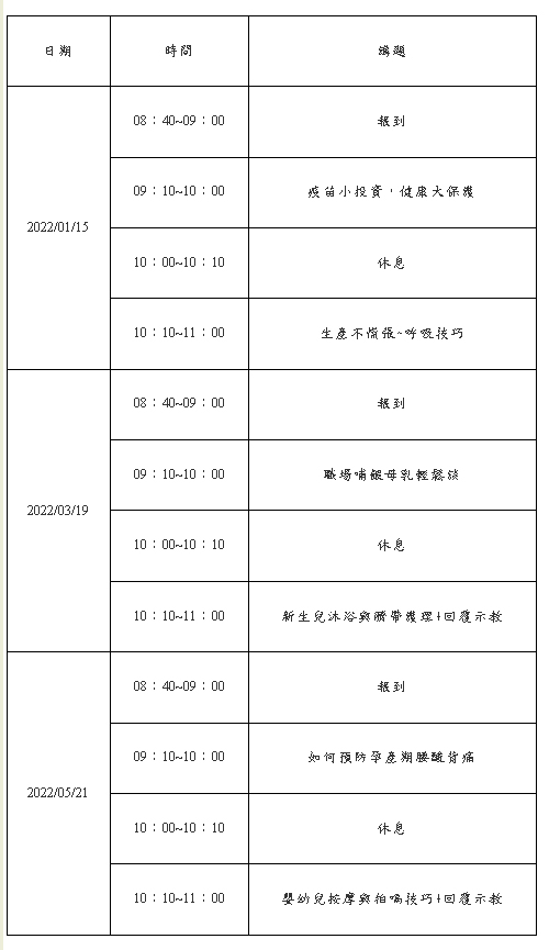 2022年上半年度準爸爸媽媽教室系列課程表