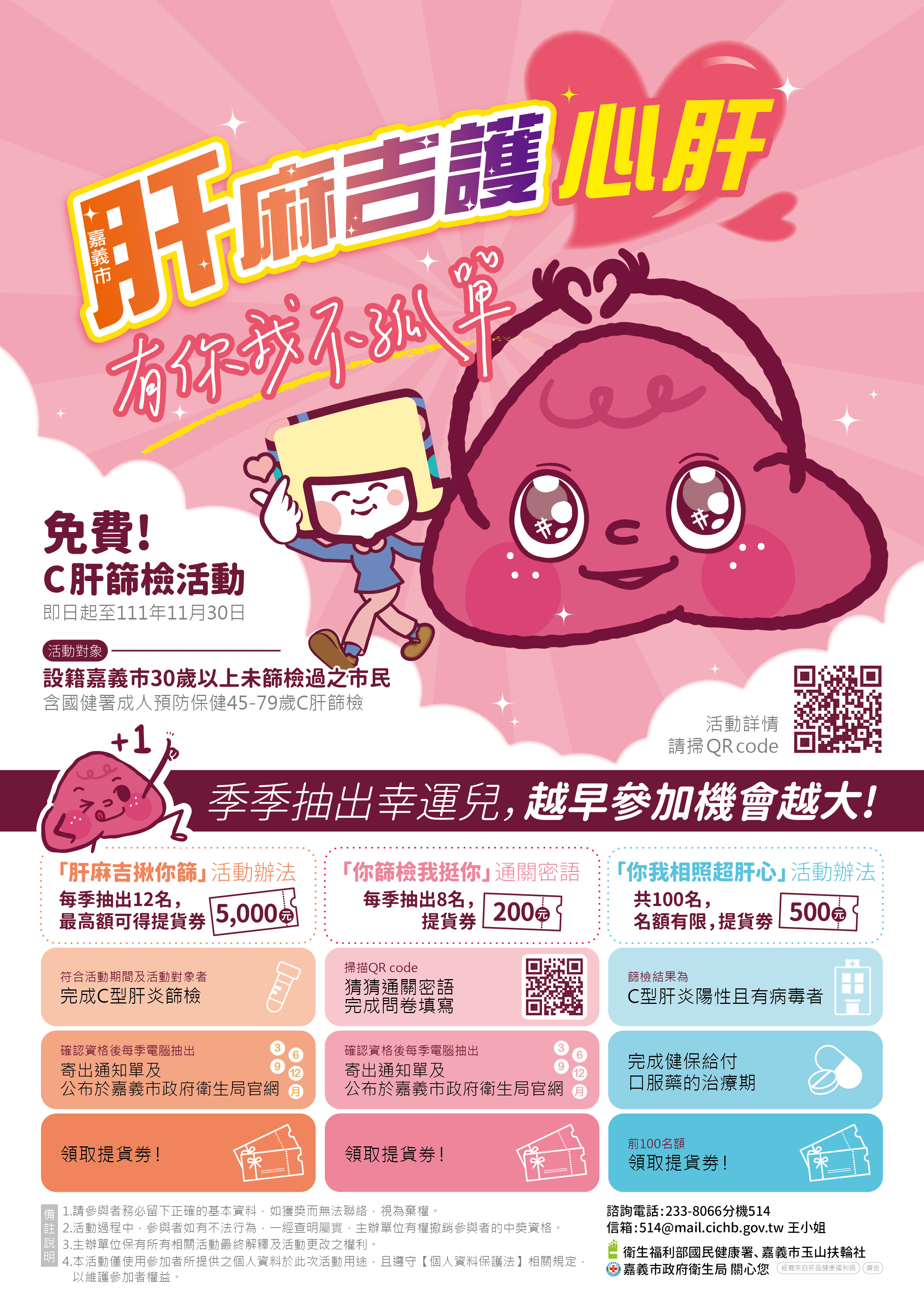 111年嘉義市政府衛生局辦理”C型肝炎篩檢暨抽獎活動”,鼓勵未曾篩檢過嘉義市民參與篩檢抽大獎!