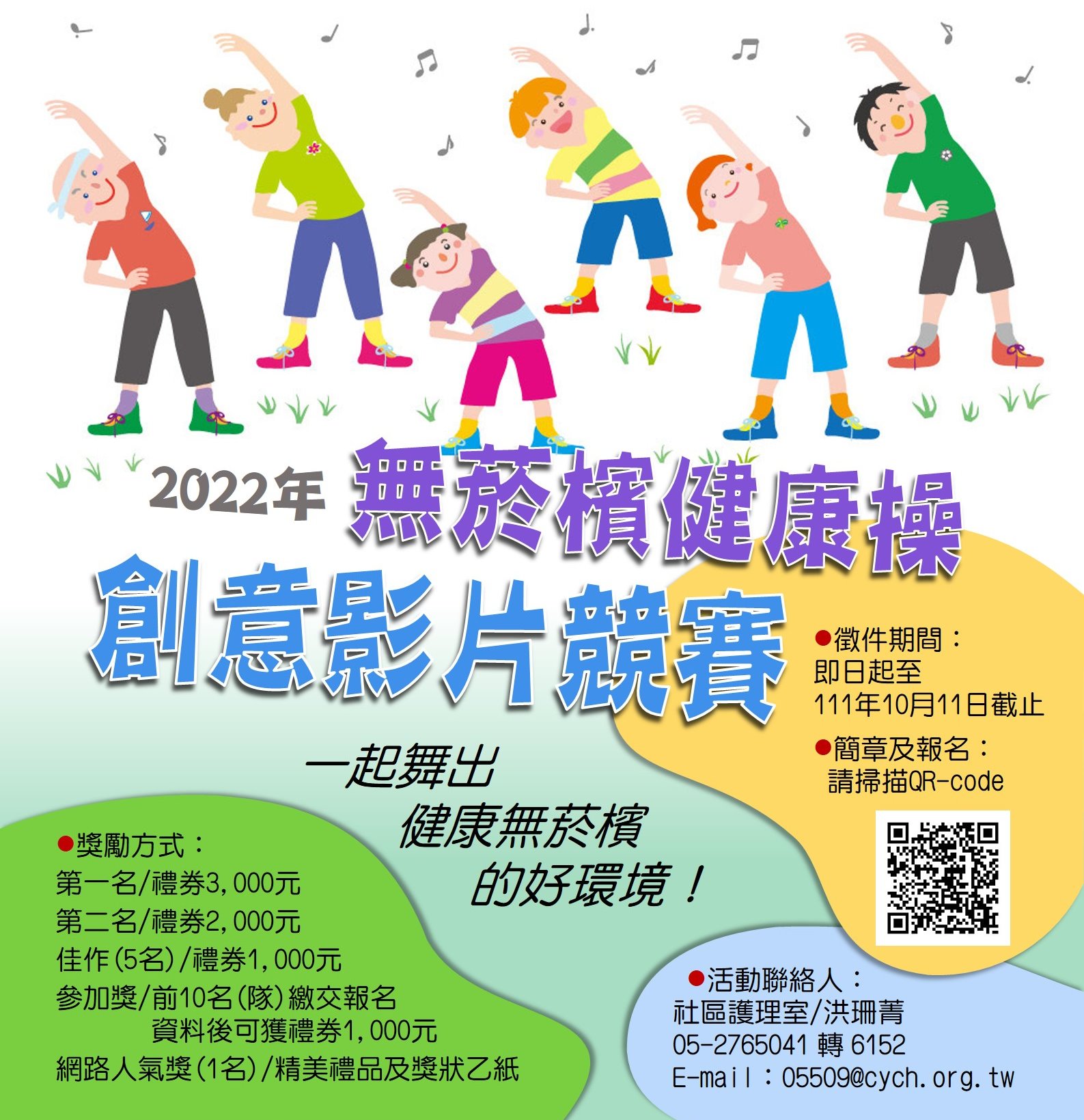 Email 至05509@cych.org.tw,信件主旨:無菸檳健康操創意影片競賽。相關連結https://docs.google.com/document/d/1kzbDMhNPJcQs9os8mJfbwK-2VX7XPE3p/edit?usp=sharing&ouid=118316150419134017173&rtpof=true&sd=true附加檔案 2022831無菸檳健康操創意影片競賽活動辦法-F.pdf