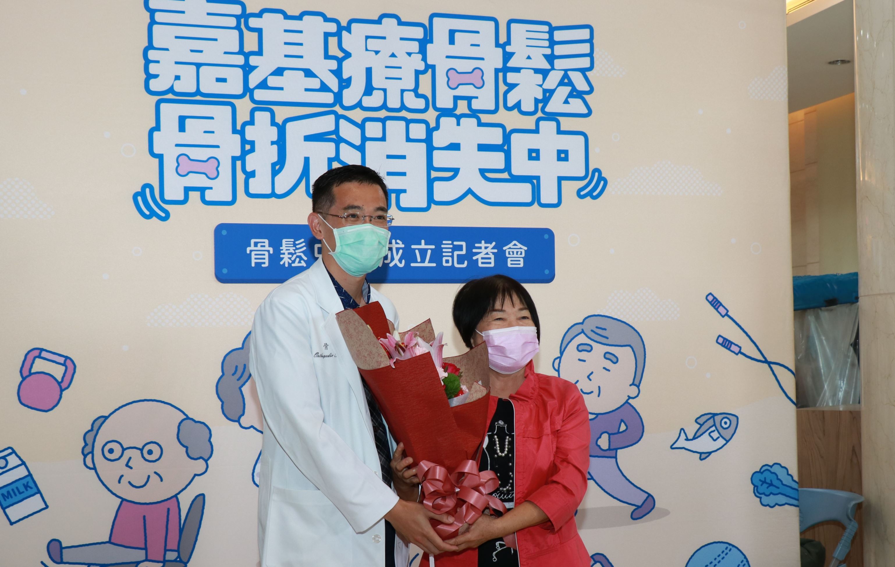 陳女士,70多歲,多年前就有骨質疏鬆的症狀,但不以為意,三年前因不慎摔跤,當下只覺得腳怪怪就找推拿師進行推拿,不料隔天就無法下床,後經朋友推薦找到嘉基骨科吳政誼醫師,進行診斷後為第一腰椎壓迫性骨折,隨即進行開刀治療,3個月的治療期間吳醫師及「骨折聯合照護」團隊都會給予關心支持,補充骨鬆藥物及維生素D,目前已恢復正常狀況,可以快樂爬山。特別獻花感謝吳醫師及團隊,場面溫馨。