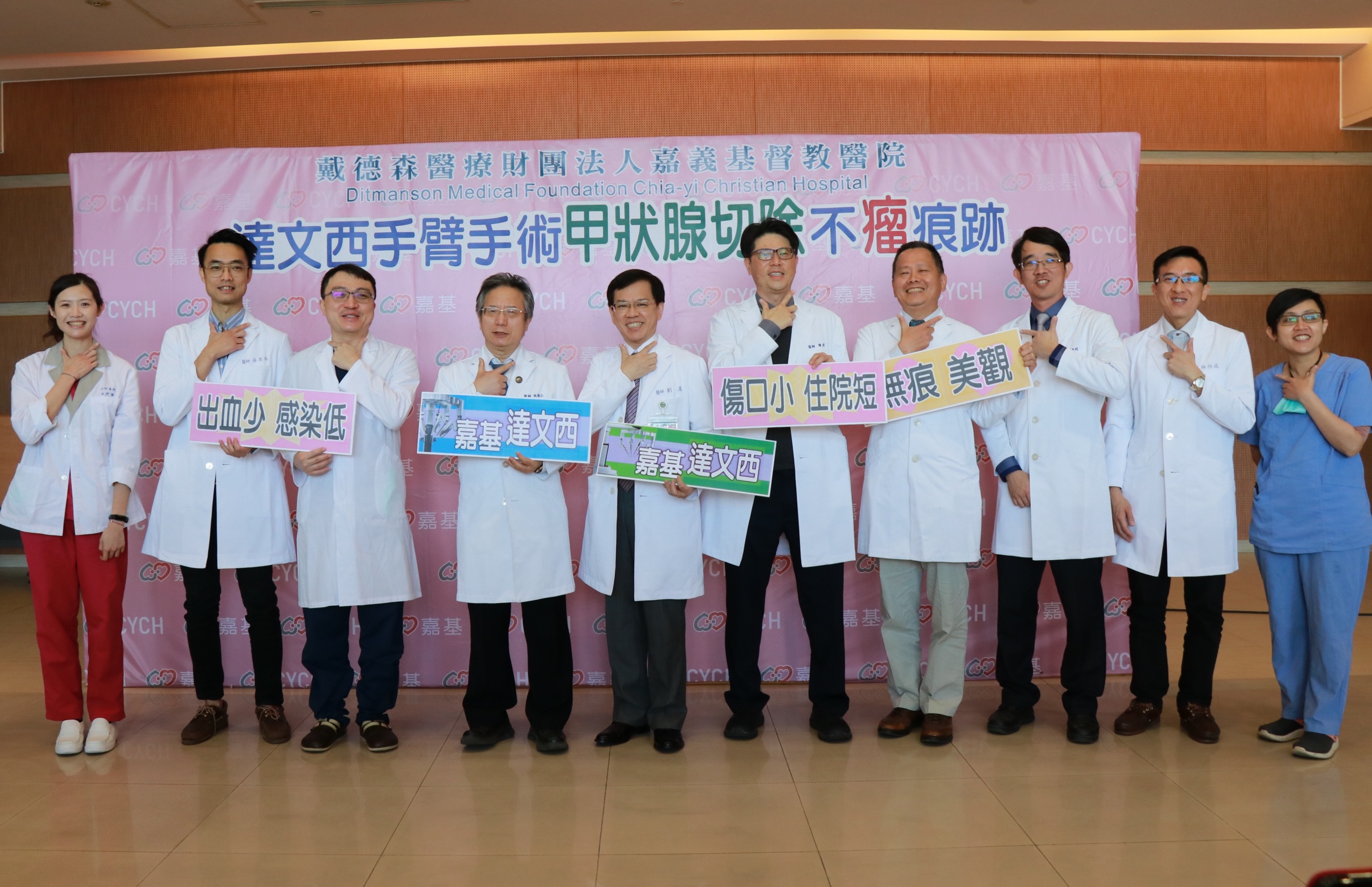傳統甲狀腺手術會在頸部留下一條6-8公分的明顯疤痕,許多患者因此不願接受手術,延誤治療時機。嘉義基督教醫院特於3月8日(三)舉行「嘉基達文西 甲狀腺切除 不瘤痕跡記者會」,以達文西手術系統為患者提供更安全、精準的甲狀腺手術,不僅腫塊消除,聲音不會沙啞,且頸部不留痕跡。