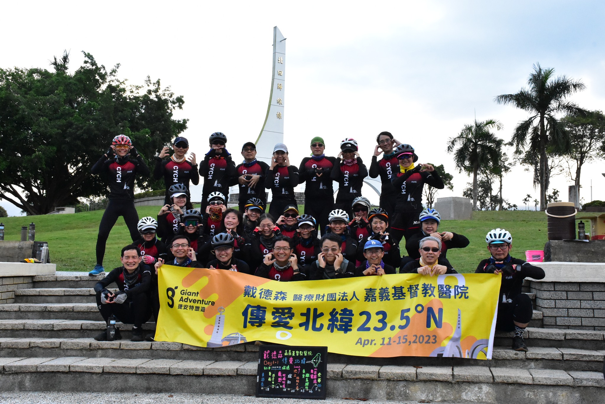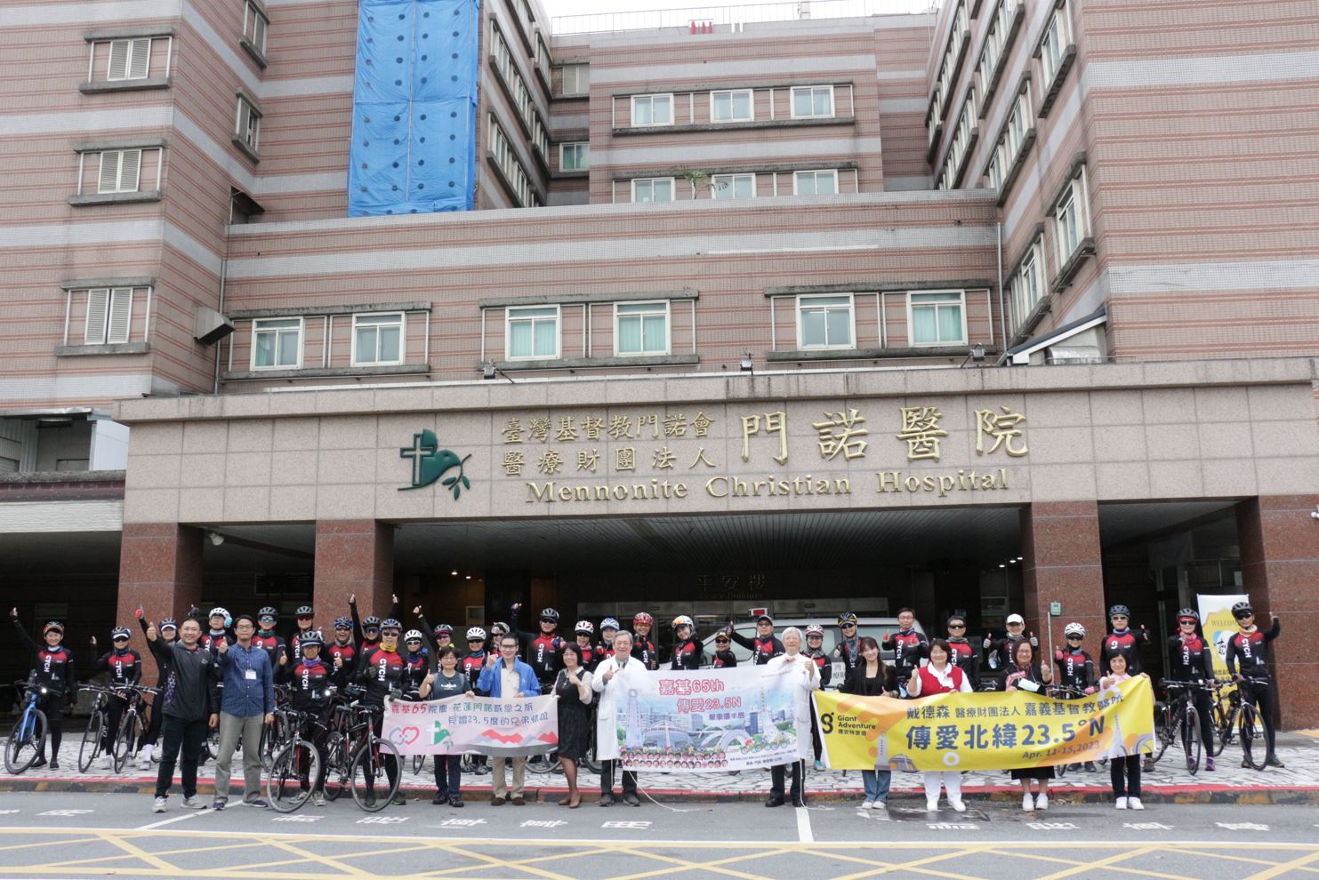 嘉義基督教醫院今年創院65周年,院慶活動「單車環半島-跨越23.5度的愛」由嘉基陳明晃副院長擔任總領隊,30位團員於4月11日出發,歷經五天抵達花蓮門諾醫院,用行動感謝門諾醫院於1957年接納嘉基創院院長戴德森醫師,成為其設立嘉基的養分。