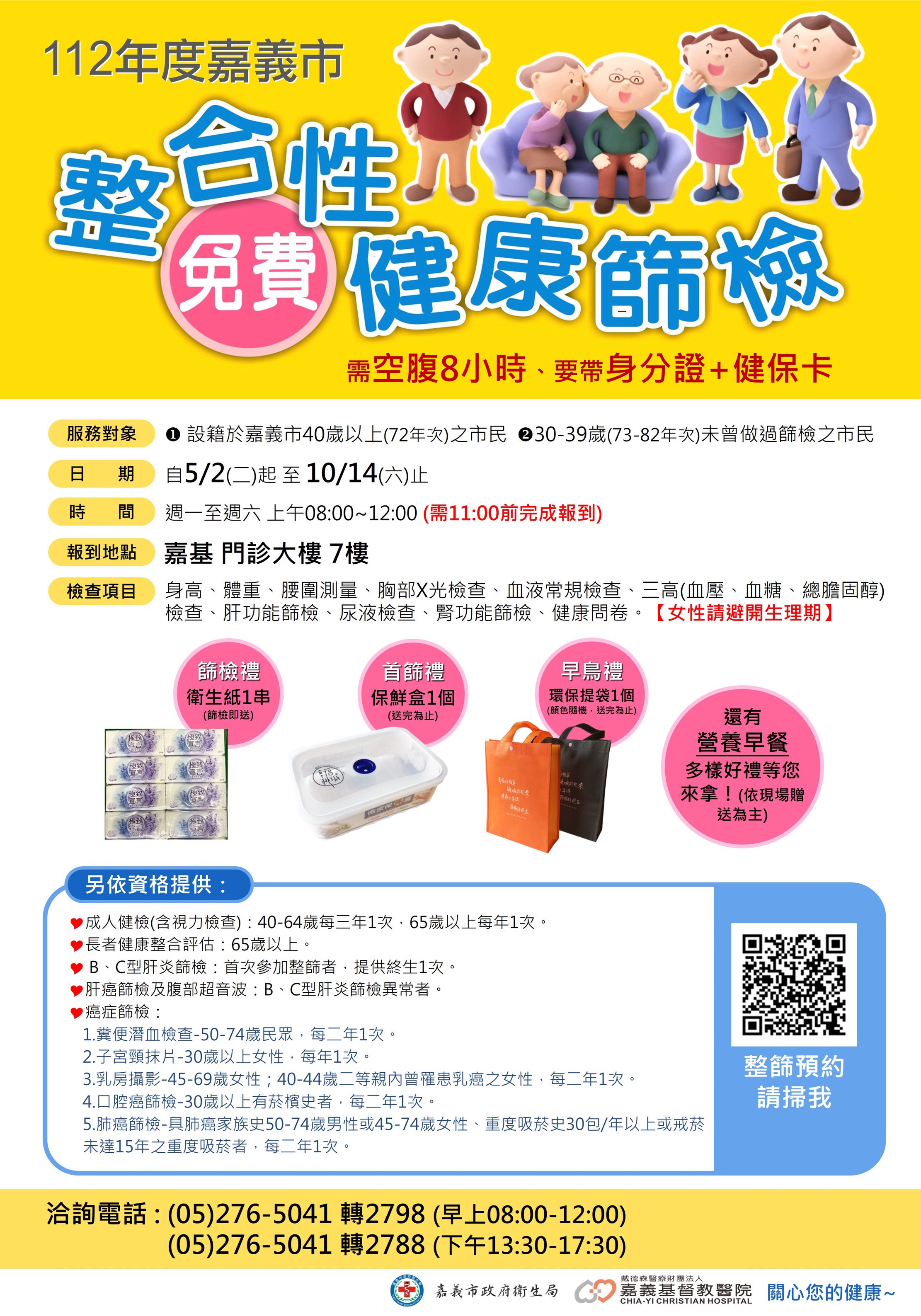 <嘉義市民免費整合性篩檢>開跑囉!免費健檢還送好禮,歡迎來做檢查~