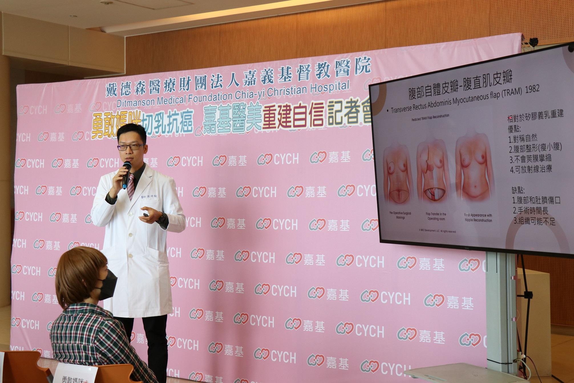 陳坤翰主任表示:世界衛生組織將乳癌歸類於可治癒疾病,且女性乳癌長年居女性癌症第一名,所幸台灣在政府大力篩檢及醫療進步的環境下,國內乳癌五年的存活率可高達90%以上,在乳癌診斷後的治療,包含手術切除、放射線治療、化學治療及賀爾蒙治療等。手術切除仍是乳癌主要治療手段,除特殊情況之外,以全乳房切除為主。而乳房是非常重要的女性性別特徵,對於女性身心靈健全有不可或缺的地位,且在全乳房切除後,會因缺損導致肩部活動不順及穿衣不方便是很顯著的。院長姚維仁也說:嘉基自2012年開始執行腹部自體皮瓣手術,提供雲嘉南地區女性在全乳房切除後重建的選擇,迄今已超過200例,成功率達99.5%,不亞於醫學中心及全世界各大乳房重建中心。