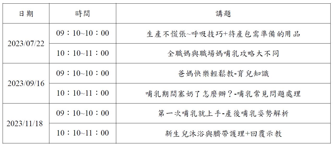 2023年下半年度準爸爸媽媽教室系列課程表