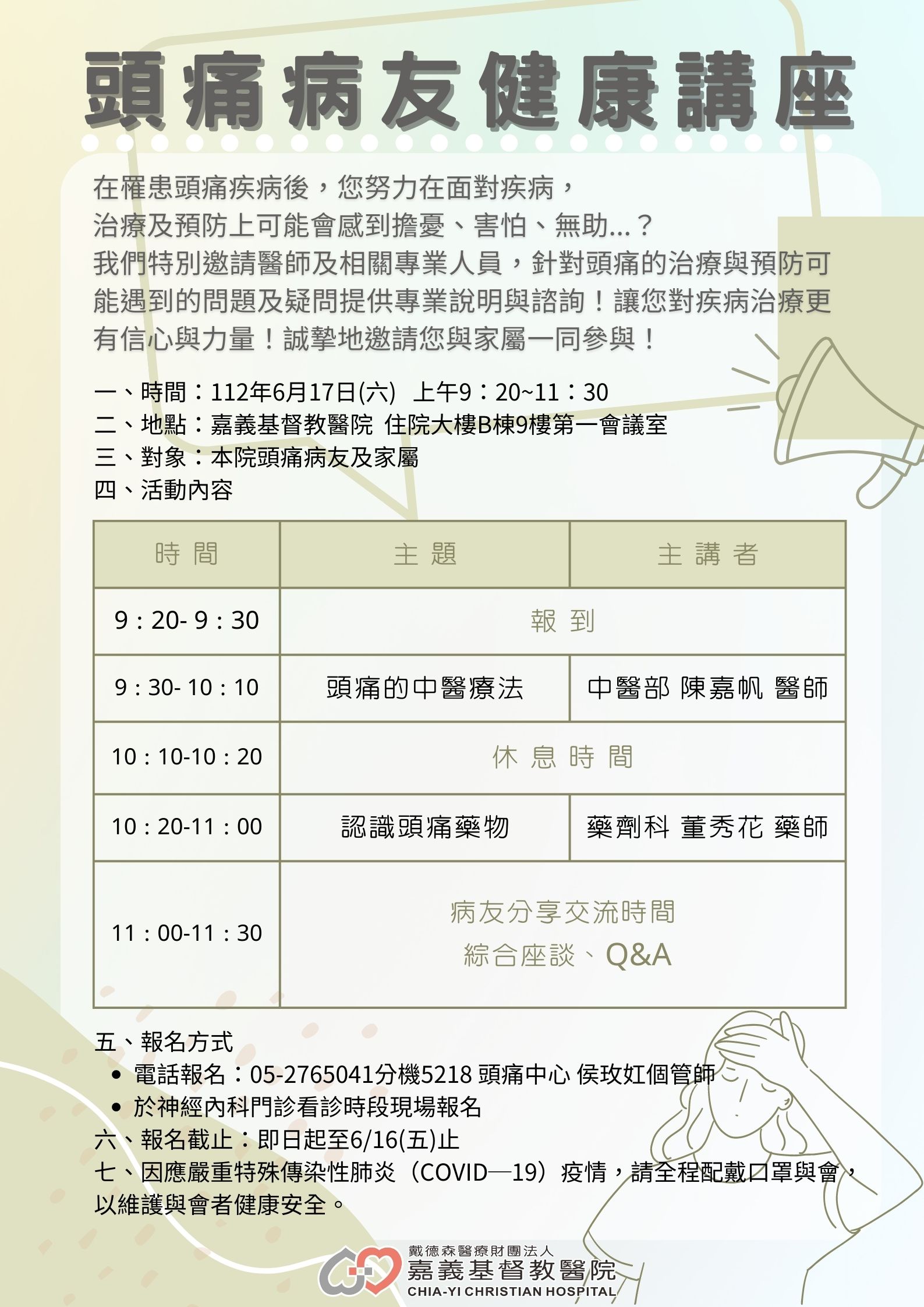 6月17日頭痛病友健康講座 歡迎踴躍參加