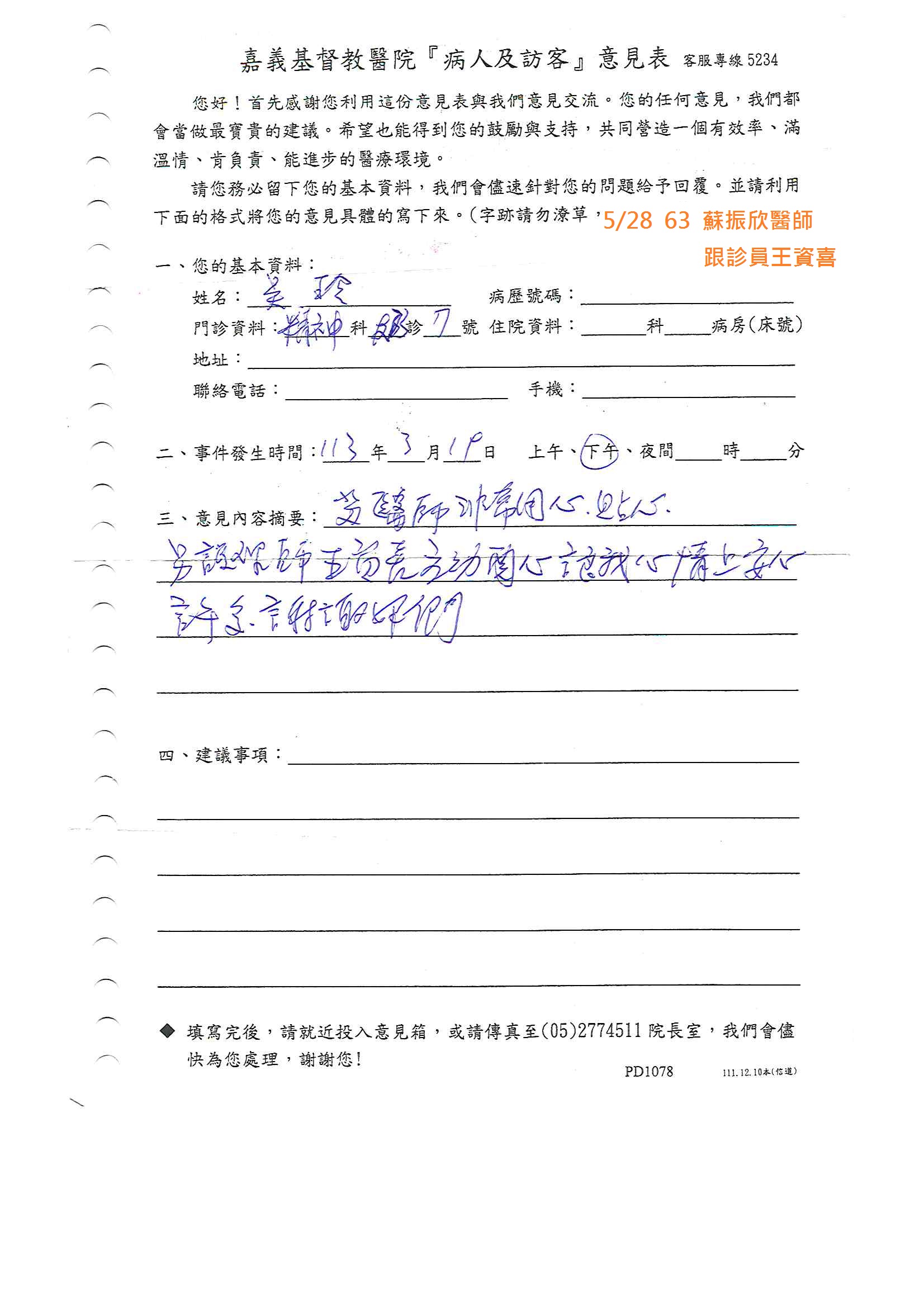 讚美 精神科 蘇振欣醫師
