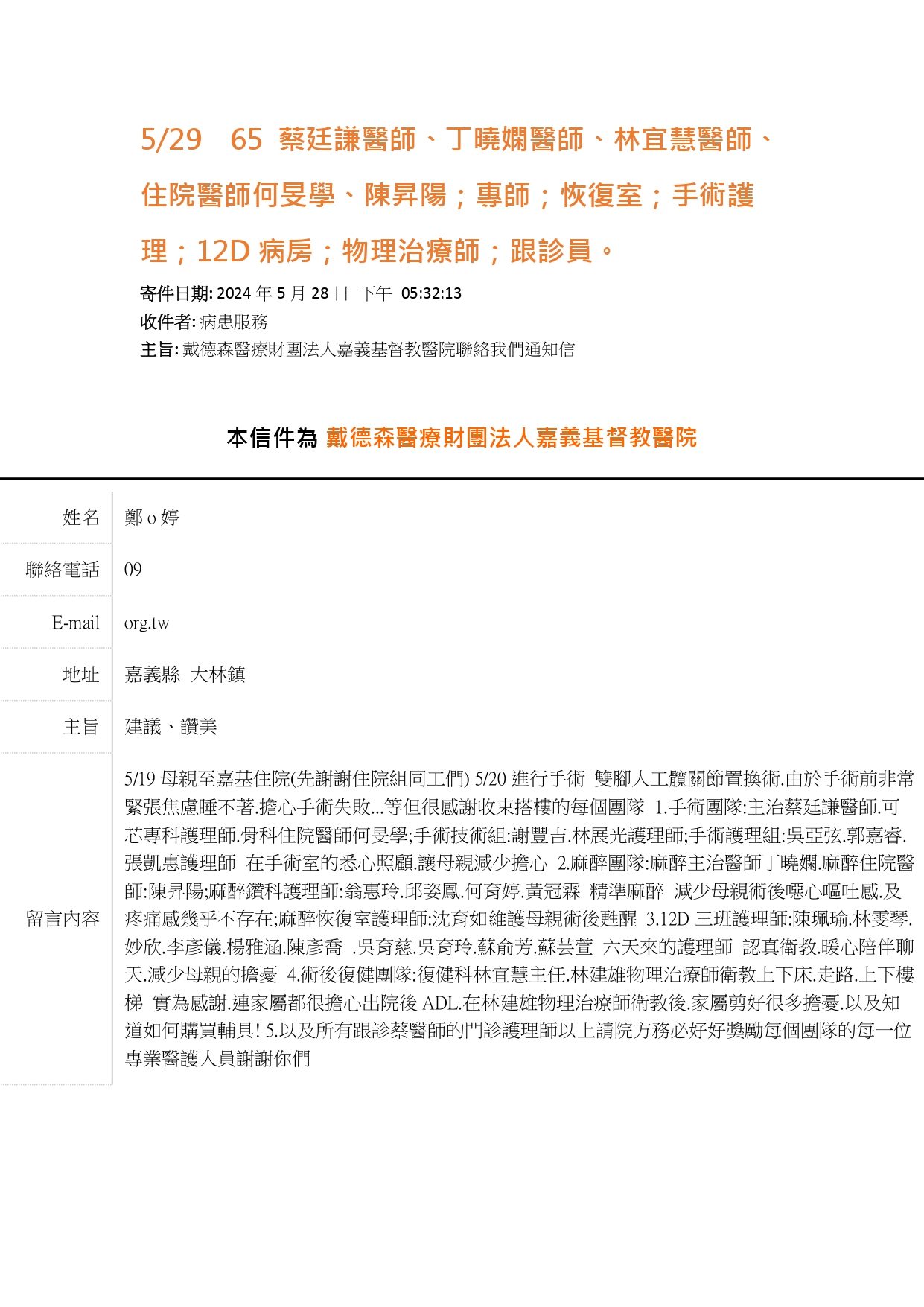 愛是永不止息- 來自病人的肯定及感謝 嘉基 復健科 林宜慧醫師【視病如親 】