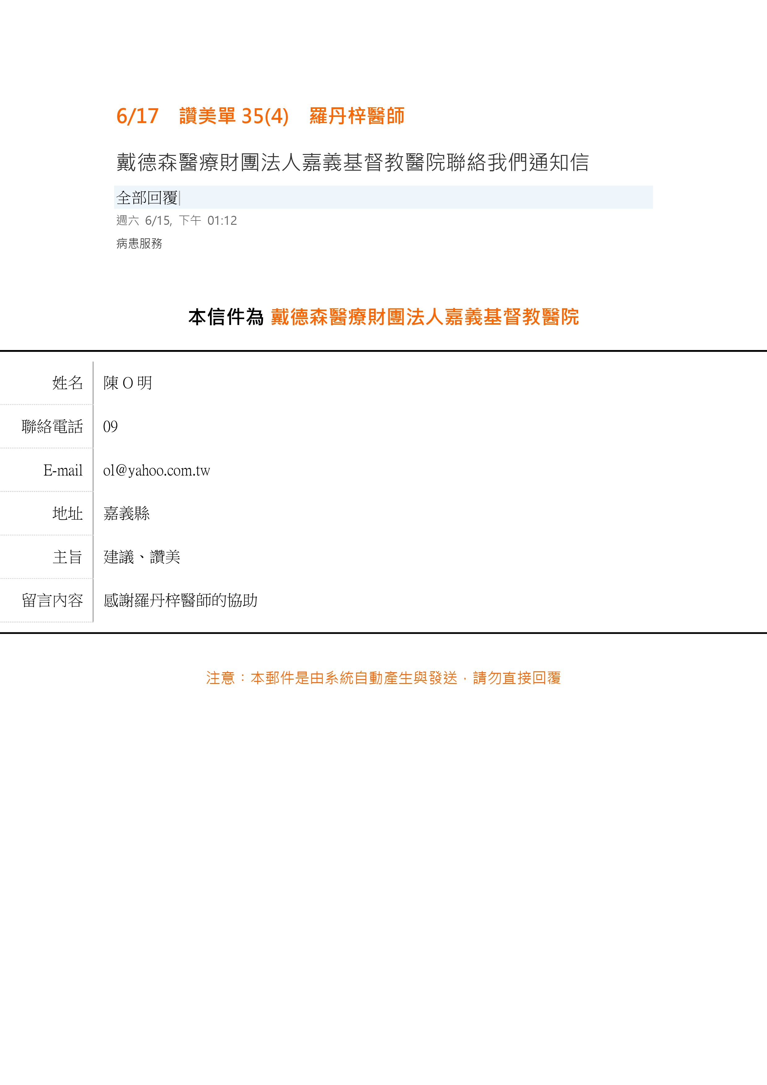 愛是永不止息 來自家屬的肯定及感謝 嘉基 婦產部羅丹梓醫師【視病如親】