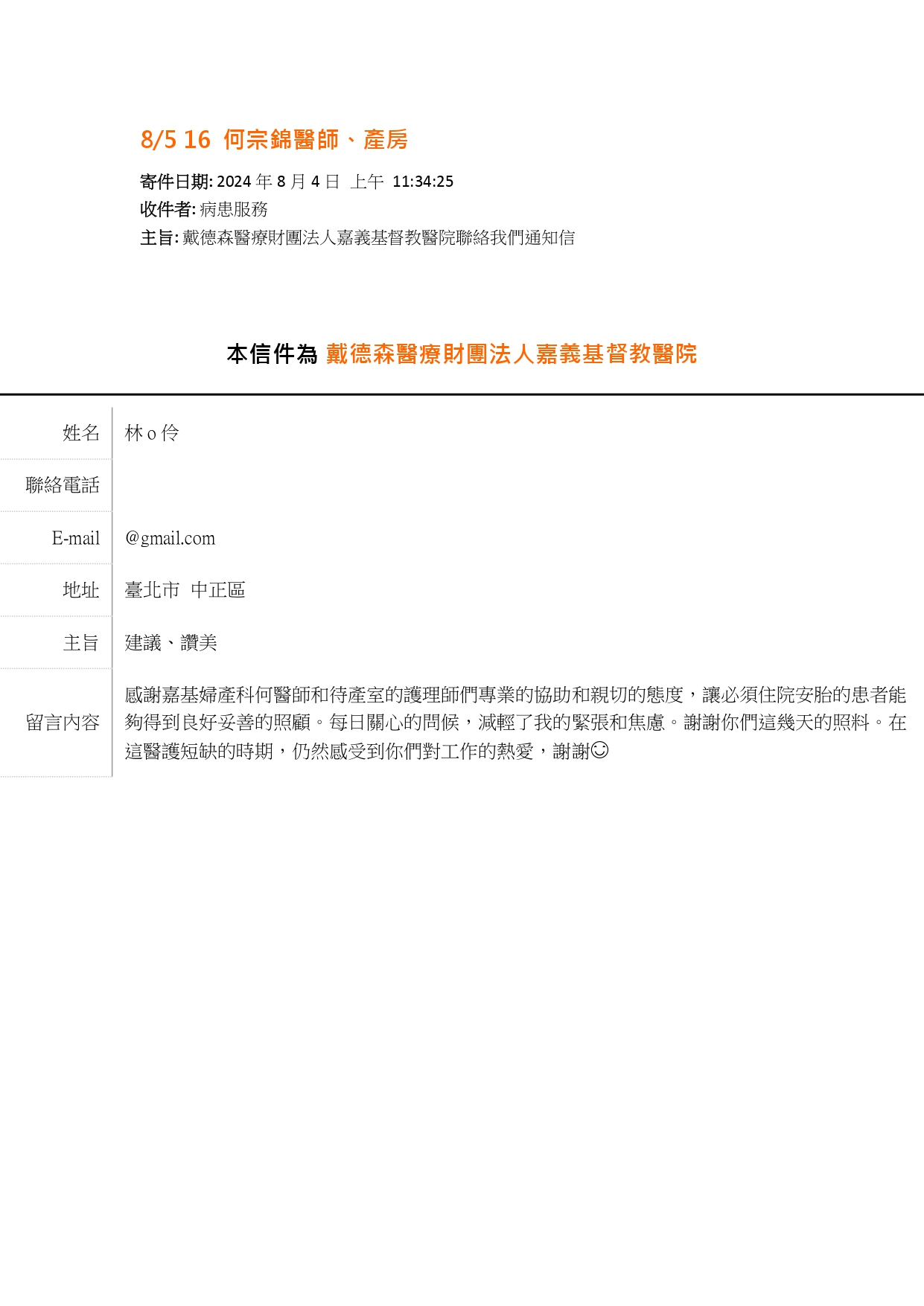 愛是永不止息- 來自病人的肯定及感謝 嘉基 婦產部 何宗錦醫師【視病如親】
