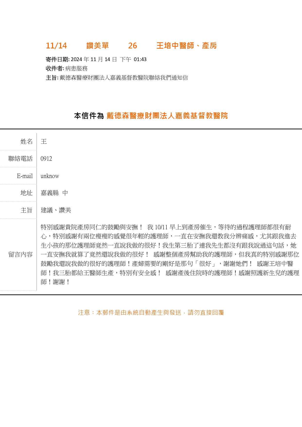 愛是永不止息 來自病人 家屬 的肯定及感謝 嘉基 婦產部王培中醫師【視病如親】