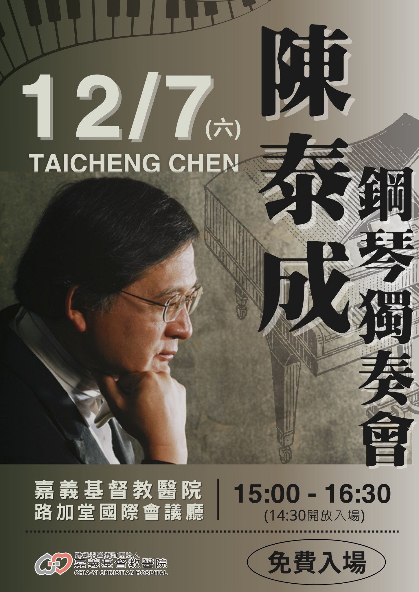 國際知名鋼琴大師陳泰成的獨奏會將於2024年12月7日(六)下午3時於嘉基的路加堂國際會議廳舉行。本次音樂會將展示這位鋼琴大師高超的琴藝與對音樂的無盡熱情,為所有參與者帶來一場不可多得的音樂盛宴。