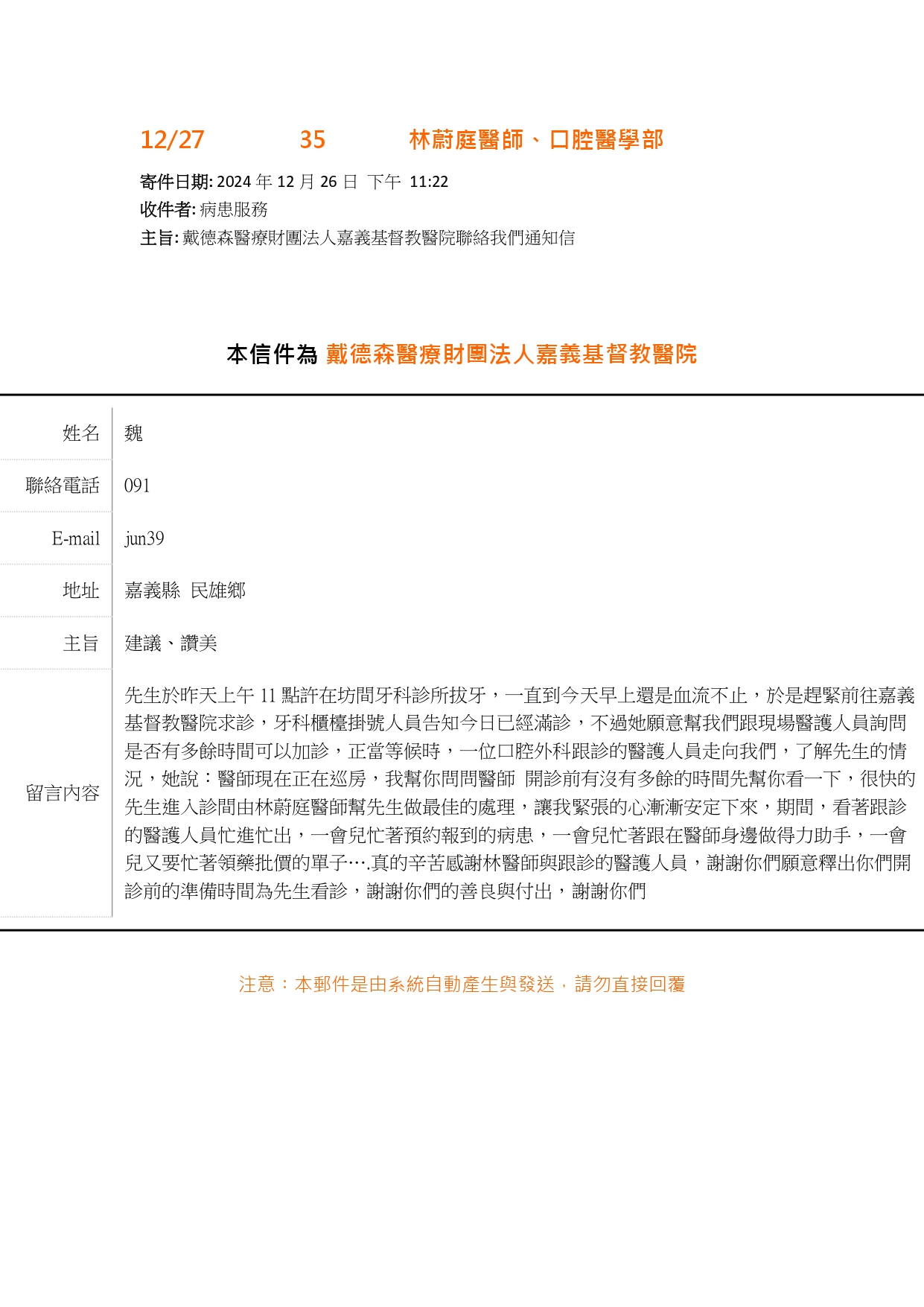 愛是永不止息 來自病人 家屬 的肯定及感謝 嘉基 口腔醫學部林蔚庭醫師【視病如親】