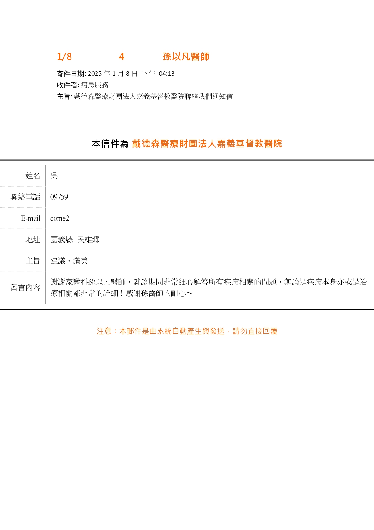 愛是永不止息 來自病人 家屬 的肯定及感謝 嘉基 家庭醫學科孫以凡醫師【視病如親】