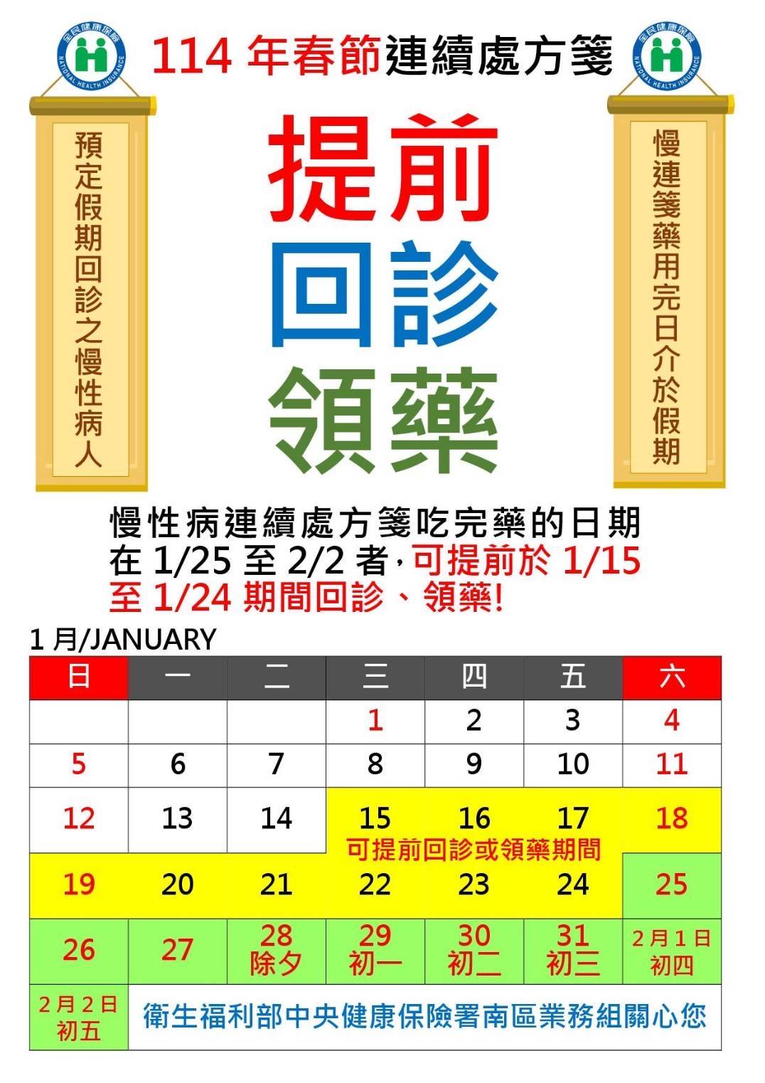 若您的藥品領藥日期落在1/25至2/2,請提前於1/15至1/24回診領藥!