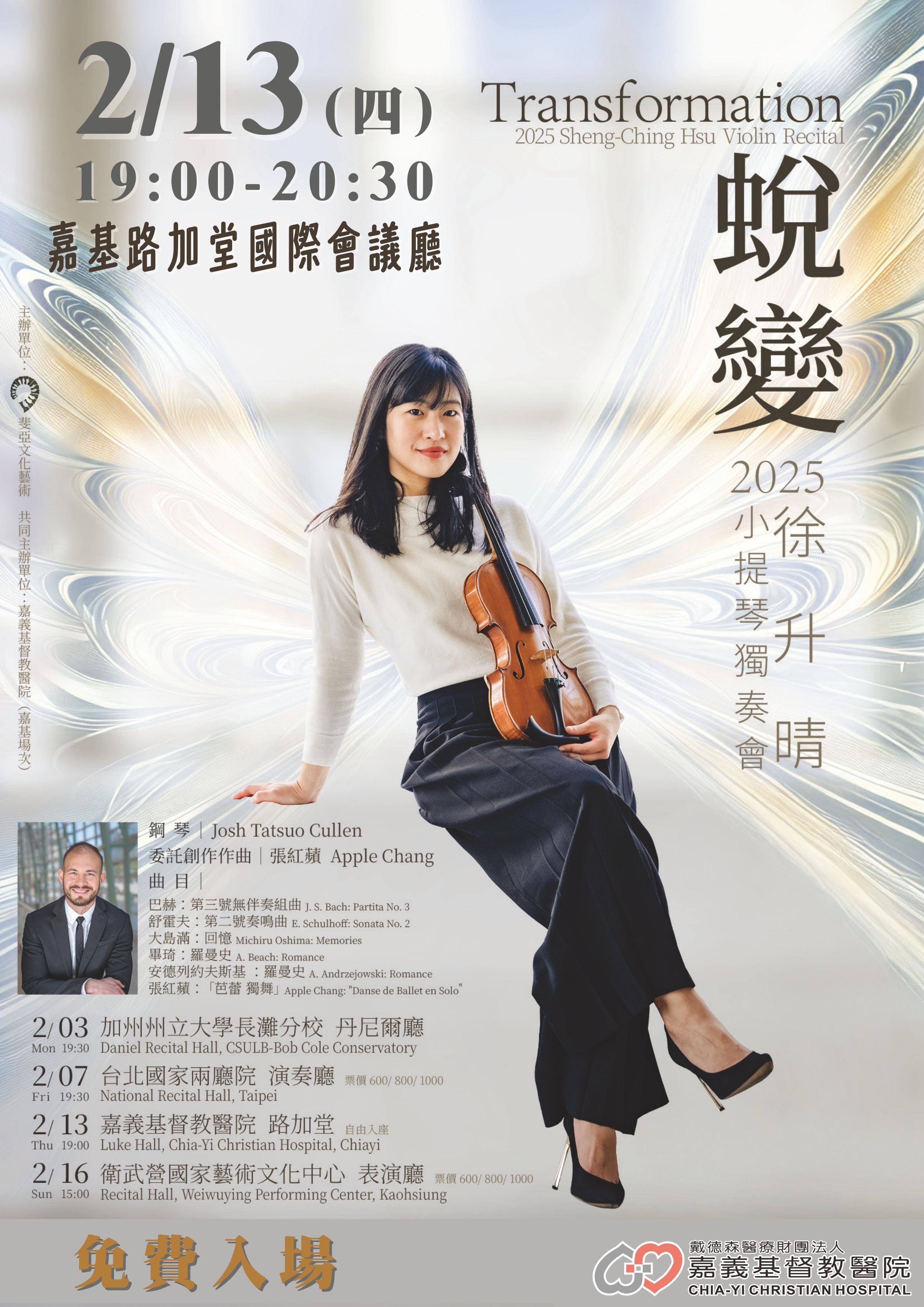 本院榮幸邀請到國際知名小提琴家 徐升晴 蒞臨演出 🎶✨徐升晴小提琴家簡介國內外樂壇矚目的小提琴家,自幼展現過人音樂天賦,畢業於國立台灣藝術大學音樂系,並獲得美國茱莉亞音樂學院的碩士學位。她以卓越的演奏技術和細膩的音樂詮釋,贏得多項國際比賽殊榮,包括巴黎國際小提琴大賽銀獎與亞洲青年音樂大賽金獎等。作為一位活躍於國際舞台的藝術家,徐升晴曾與多個知名交響樂團合作,包括維也納愛樂、柏林交響樂團及國家音樂廳管弦樂團等。她足跡遍布歐洲、美洲與亞洲的重要音樂廳,以純熟技巧與深厚情感震撼每一位觀眾。除了在古典音樂界的成就,她也致力於音樂教育與公益活動,透過音樂療癒人心,讓更多人感受到音樂的力量。這次在嘉義基督教醫院的演出,徐升晴將以精心挑選的經典曲目,為大家獻上一場融匯情感與藝術的音樂饗宴。🌟本次活動亮點:🔹 國際水準現場演奏:親臨體驗,感受現場音樂的震撼。🔹 不限年齡,歡迎所有喜歡音樂民眾一同來享受!🔹 國家音樂廳演奏是收費的,在嘉基完全免費演出。📍活動資訊:🗓 日期:2025年2月13日(星期四)⏰ 時間:晚上19:00-20:30🏢 地點:嘉義基督教醫院 路加堂國際會議廳完全免費入場,但座位有限,額滿為止,提早半小時開放入場,搶占最佳聆聽位置!