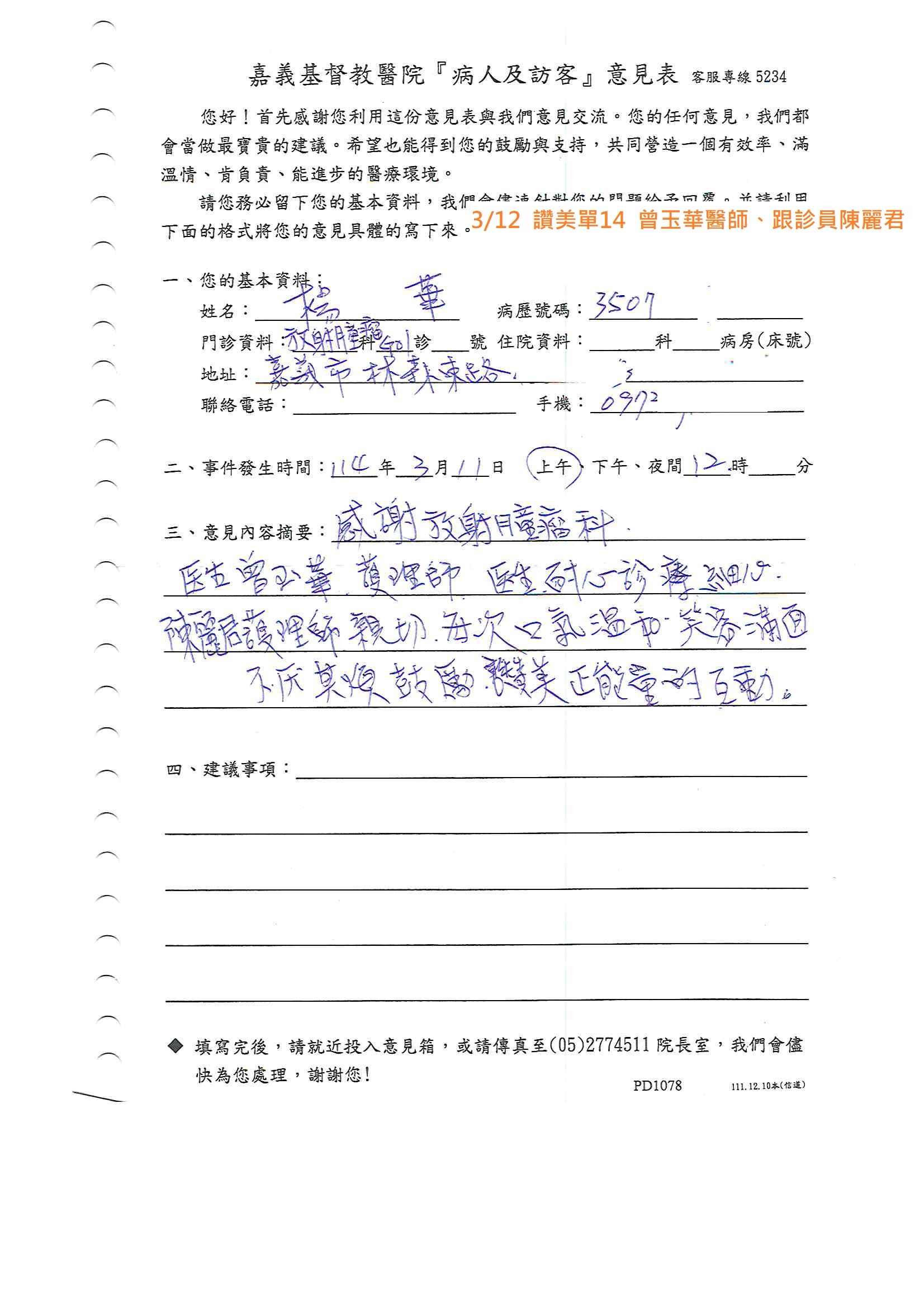 讚美 放射腫瘤科 曾玉華醫師