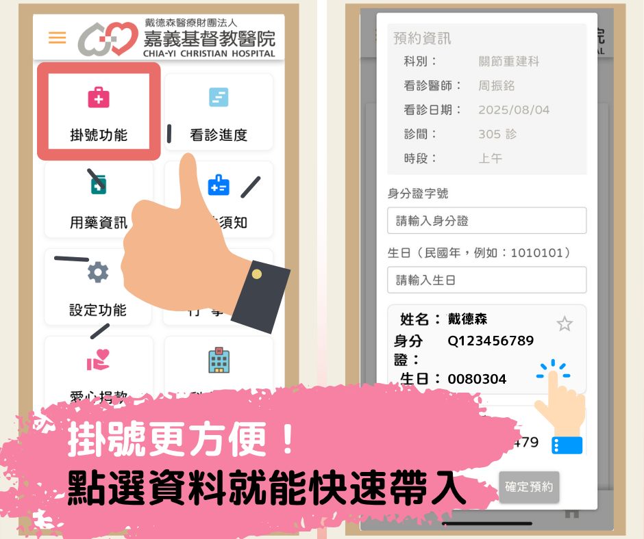 家裡有長輩、小孩需要幫忙掛號?每次都要重新輸入資料,好麻煩?設定好常用身份後,下次掛號時,點選一下就能帶入資料,省去重複輸入的麻煩,讓您掛號更省時!