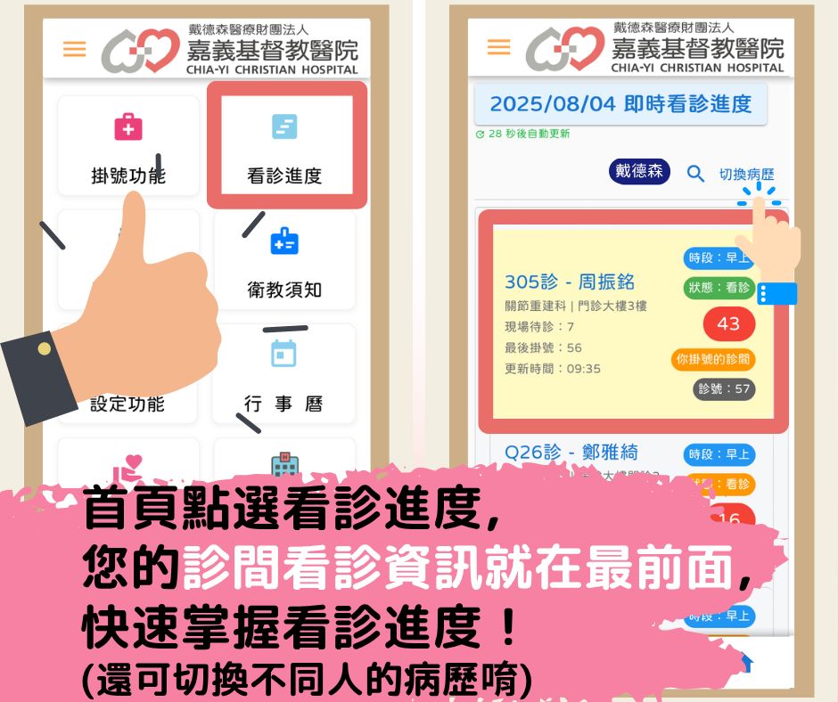 這是最讓大家驚豔的功能!當您設定好常用身份後,在APP的「看診進度」查詢頁面,系統會自動將您或常用身份所掛的診間資訊「置頂」顯示!您再也不用在長長的列表中滑來滑去,辛苦尋找自己的看診號碼了!省下時間,讓您更從容地掌握看診進度。