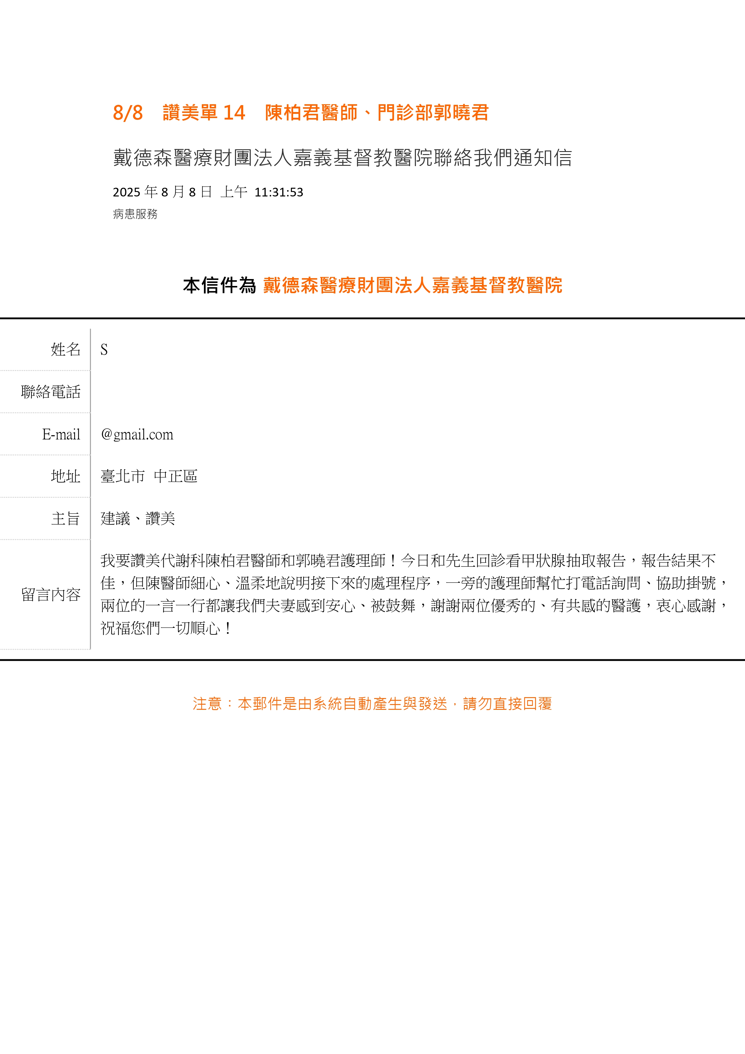 愛是永不止息- 來自病人的肯定及感謝 嘉基 內科部陳柏君醫師【視病如親】