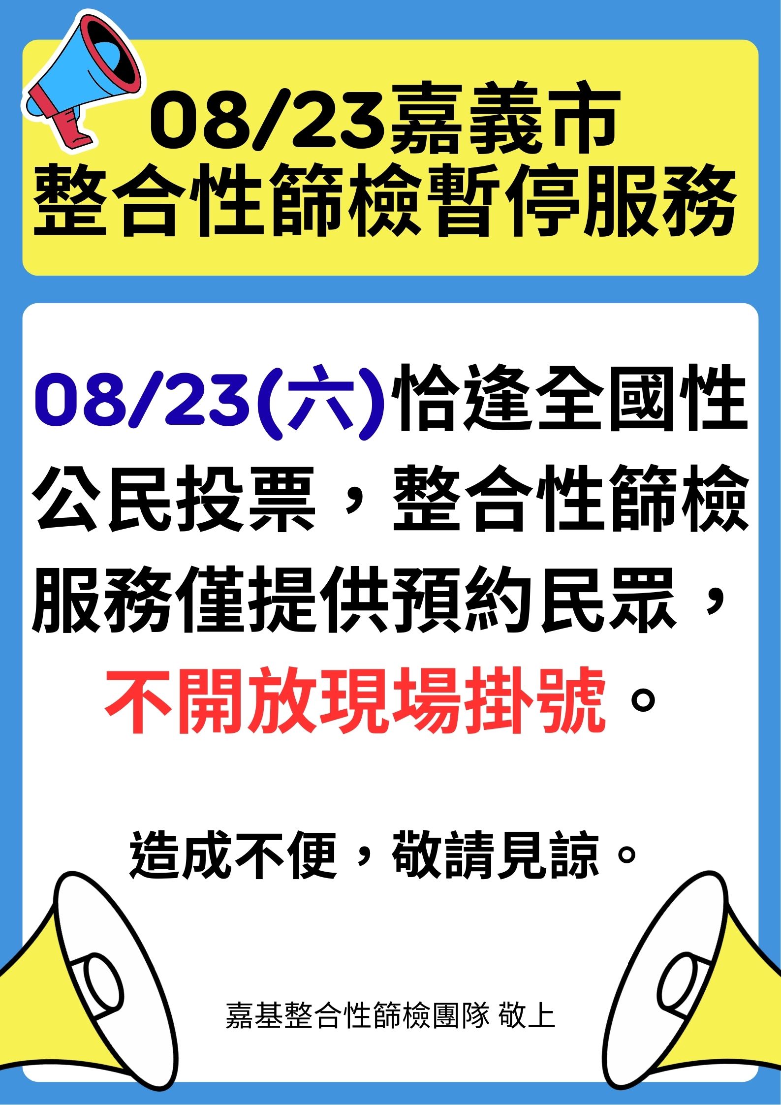 恰逢全國性公民投票,整合性篩檢服務僅提供預約民眾,不開放現場掛號,造成不便,敬請見諒。