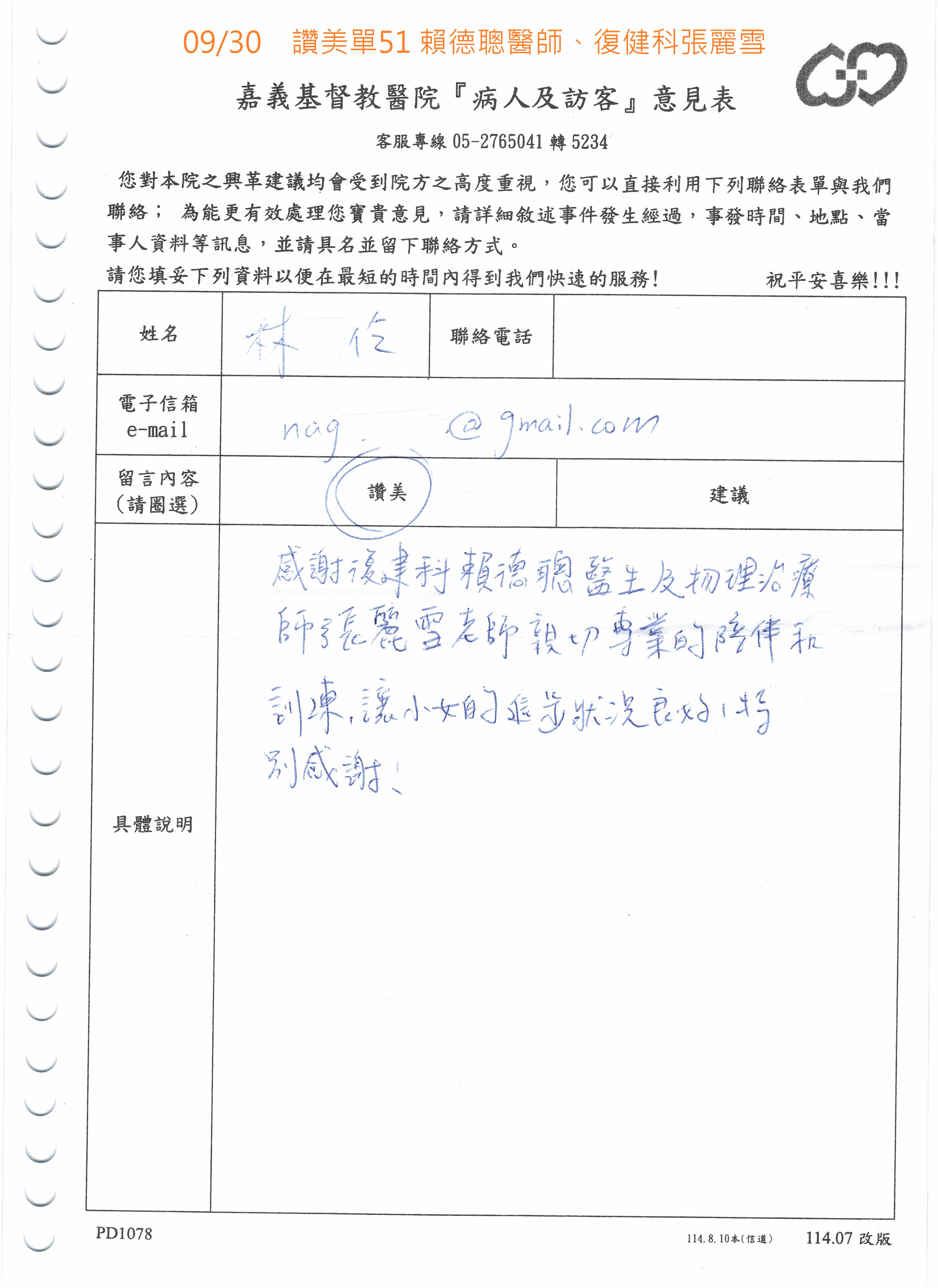 讚美 復健科 賴德聰醫師